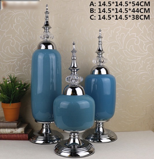 Modern çizgilere sahip bu dekoratif vazo seti, zarif tasarımı ve etkileyici renk seçimiyle dikkat çekiyor. Set, farklı boyutlarda üç parçadan oluşuyor ve her bir parça mavi seramik gövde ile krom kaplama metal detayların uyumunu yansıtıyor.
